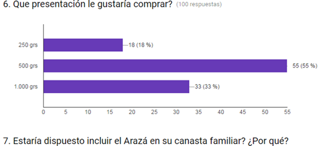 Nuestra encuesta consta de 9 preguntas, las tres primeras son información general referente si conoce la fruta, las ventajas nutricionales y si consume con mayor frecuencia, desde la pregunta 4 hasta la 8 tiene como objetivo averiguar si el encuestado le gustaría consumir Arazá, después se desea conocer en qué lugares suelen comprar para poder introducirnos más en ese mercado.En qué presentación compran y cada qué tiempo la consumen. Además de saber si se encuentran en la posibilidad de adquirir el producto y si están dispuestos a incluirla en la canasta familiar, la pregunta 8 se desea conocer cuánto consumiría usted el producto a base de Arazá.La pregunta 9 está relacionada con el precio está a su vez está relacionada con la presentación del producto.